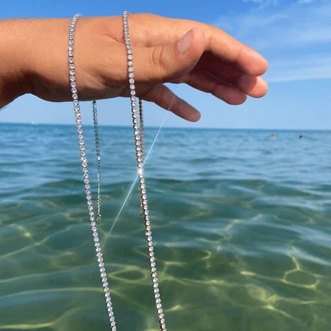 The "Crystal" tennis necklace adds an elegant and sophisticated look.